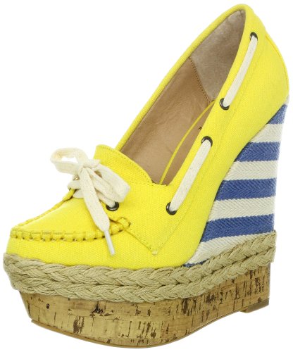Feel the ocean breeze in these nautical pumps by Penny Loves Kenny. The Bekah features a yellow fabric upper with lace and eyelet details and stitched vamp. A 6 inch wedge and 2 inch platform is enveloped with a striped canvas fabric, espadrille and earthy cork.