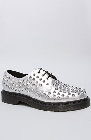 Dr. Martens Women's The Harlen All Stud 3-Eye Shoe. The Dr. Martens Harlen All Stud 3-Eye Shoe in Silver The Harlen All Stud adds an edgy twist to the classic street style 3-Eye shoe from Dr. Martens. This comfortable shoe features a silver exterior with metal studded detailing and black contrasting laces. These are perfect year round and pair great with leggings or cutoff denim shorts. Firm leather upper with a smooth finish Silver with allover metal stud detail Three eyelet shoe with lace-up closure Contrasting black laces Goodyear welted construction Rubber sole; 1.5 heel with .75 platform Please note: This shoe comes in whole sizes only By Dr. Martens.