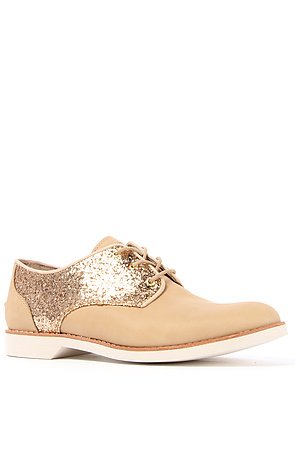 Sperry Topsider Women's The Delancey Shoe. The Sperry Topsider Delancey Shoe in Gold Glitter With a leather toe and heel, the Delancey from Sperry maintains its classic Oxford styling, but takes the look a step further with the addition of glitter, glitter, and more glitter. You’re not frumpy, so why would you want to wear a frumpy shoe? Spice up your outfit with these beauties and let your feet sparkle. Oxford shoe Tonal stitching and laces Metallic eyelets Glitter covered vamp and sides Nylon trim detail whip stitching on heel Leather welt Contrast rubber sole Fabric: Leather Imported By Sperry Topsider.