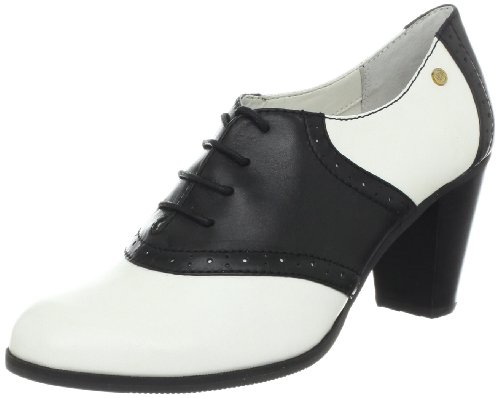 Eloise is a dressy version onf the classic saddle oxford. All over full grain leather upper. 3 inch stacked heel. Rubber flexible outsole.