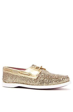Sperry Topsider Women's The A/O 2-Eye Shoe. The Sperry Topsider A/O 2-Eye Shoe in Gold Glitter Las Vegas here we come! And don’t just go see the show in these gold glitter Topsiders, but STOP the show. Liberace will be clapping for you in his grave. Low top slip on glitter shoe Tonal stitching Tonal metal eyelets Tonal metallic leather laces go through shoe and around heel Moc toe Whip stitching on heel Metallic leather vamp and collar Contrast rubber sole Fabric: Glitter covered fabric Imported By Sperry Topsider.