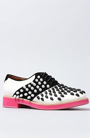 Jeffrey Campbell Women's The Henry Skull Shoe. The Henry Skull Shoe in Black, White and Pink Combo Your love for vintage street fashion called today. It told us to tell you you're welcome for these Jeffrey Campbell shoes! Leather and suede saddle shoe contrast studded scull detail on toe contrast spiked stud detail on vamp tonal stitching and laces leather lining leather midsole; contrast rubber sole. By Jeffrey Campbell.