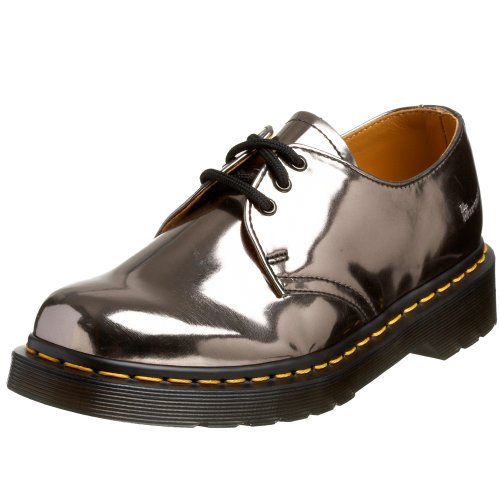 Don't be afraid to be flashy in the 1461 3 Eye Gibson oxford from Dr. Martens. The synthetic metallic upper is polished to a mirror finish, and is complemented by the traditional Dr. Martens yellow stitching. Welt construction and a PVC sole ensure durability to go along with your striking look. Synthetic metallic upper Synthetic lining Yellow stitching PVC sole Approx. 1'' heel height