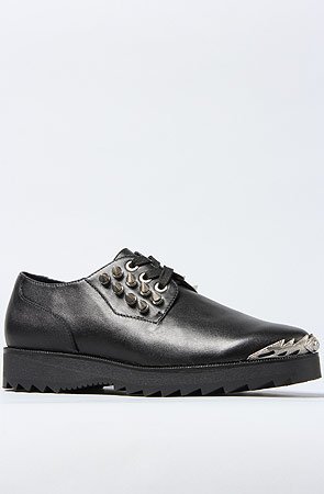 UNIF Women's The Grim Creeper Shoe. UNIF The Grim Creeper Shoe in Black This classic style low top shoe in black features metal hardware and “creepy” spikes that up the underground urban style and vibe. Leather low top shoe with tonal stitching Metal spiked studs on vamp Metal design detail on toe Tonal laces through contrast metal eyelets Embossed logo detail on heel Leather lining Rubber sole is 1.25” at heel Imported By UNIF.