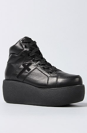 UNIF Women's The Cross Trainer Shoe. The UNIF Cross Trainer Shoe in Black Leather These platform mid oxford type sneakers feature suede cross designs on each side. The mono-tone leather shoes look awesome with a UNIF sweatshirt and Cheap Monday jeans. Padded collar and tongue Stitching around toe Metal eyelets Logo emblem on the heel Rubber soles Imported By UNIF Size & Fit 2.75 heel and 1.75 foot.